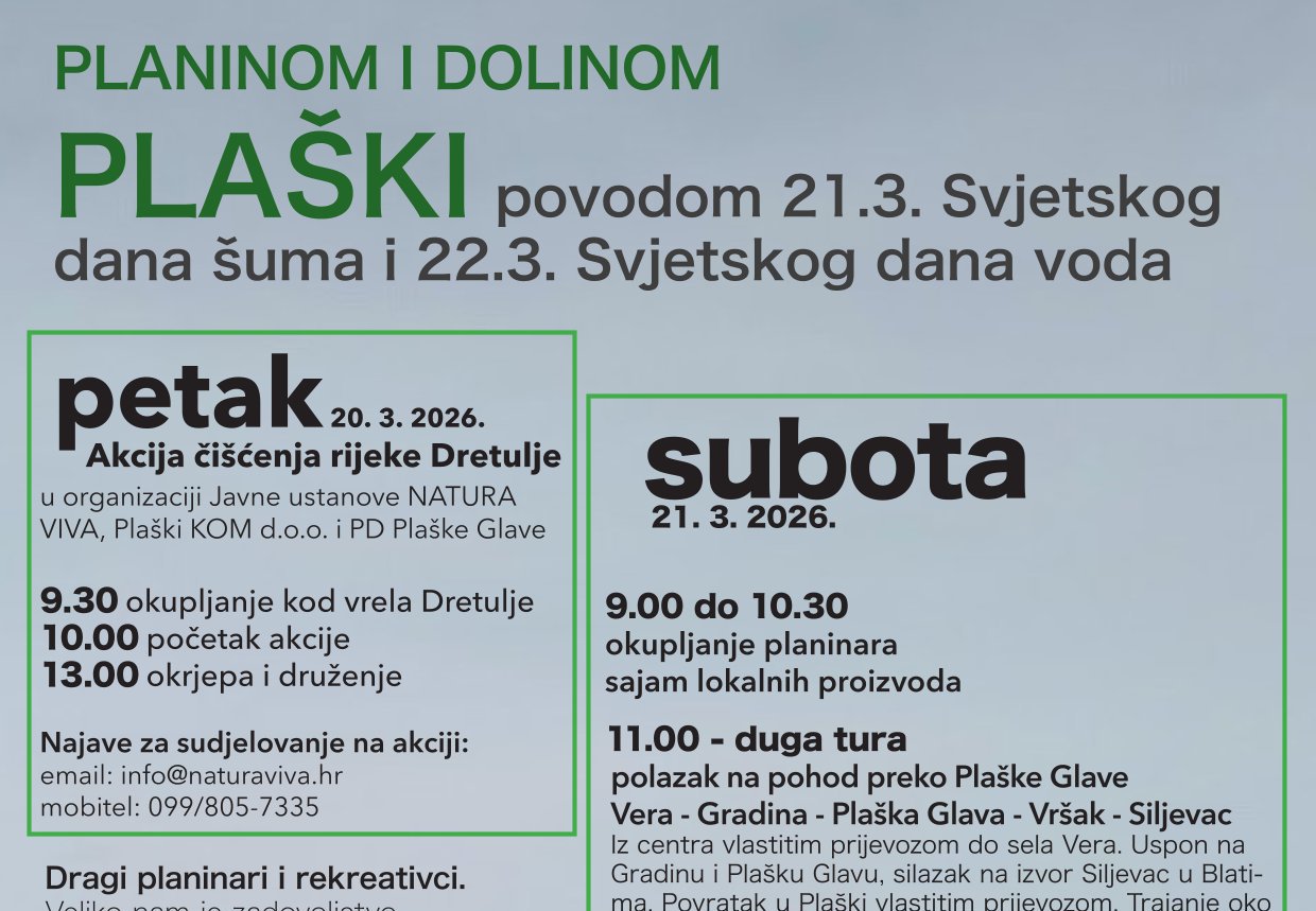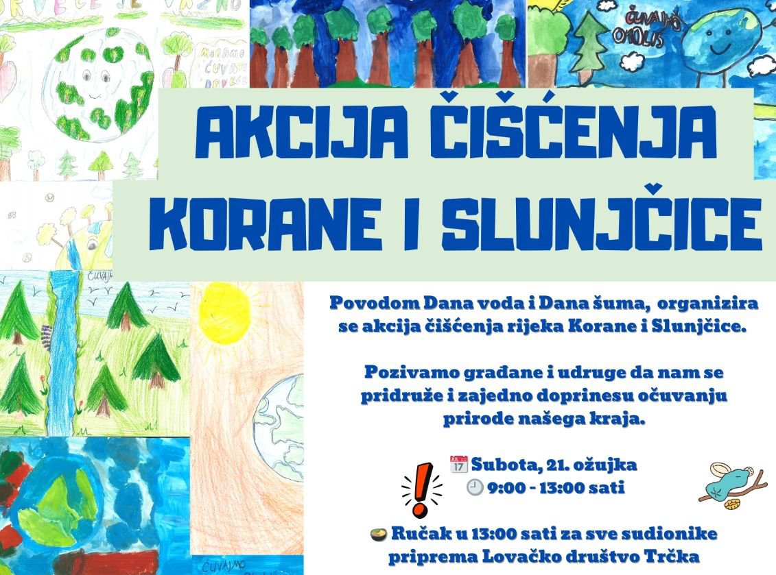 Povodom obilježavanja Svjetskog dan voda i Međunarodnog dana šuma, Javna ustanova NATURA VIVA u suradnji s Gradom Slunjem i Komunalnim društvom Lipa d.o.o. organizira akciju čišćenja rijeka Kor...